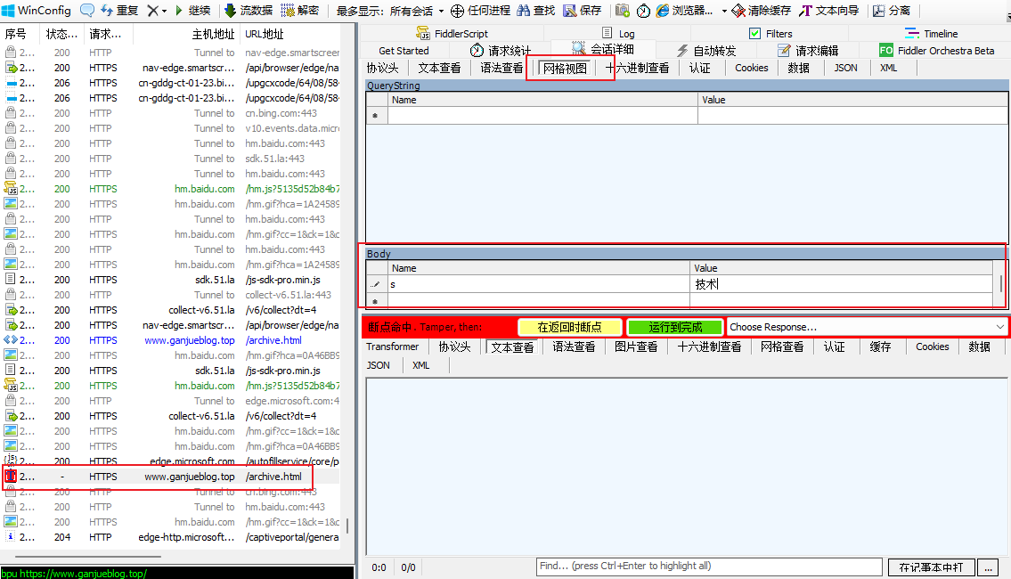 之后对需要拦截的网页进行提交数据,就能够在 fiddler 中查看到被拦截下来的数据。